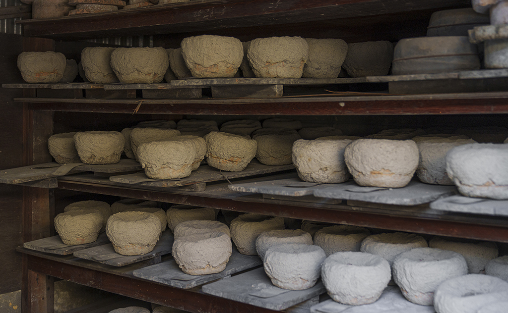 材料は「土」「粘土」「お米のもみがら」「水」。「お米のもみがら」は近所の農家さんから分けてもらい、「水」は雨水をためて使います。つくった型は一度しか使えませんが、使用後は粉砕してふるいにかけ再利用するのが基本。こうした循環型のものづくりを昔から続けています。