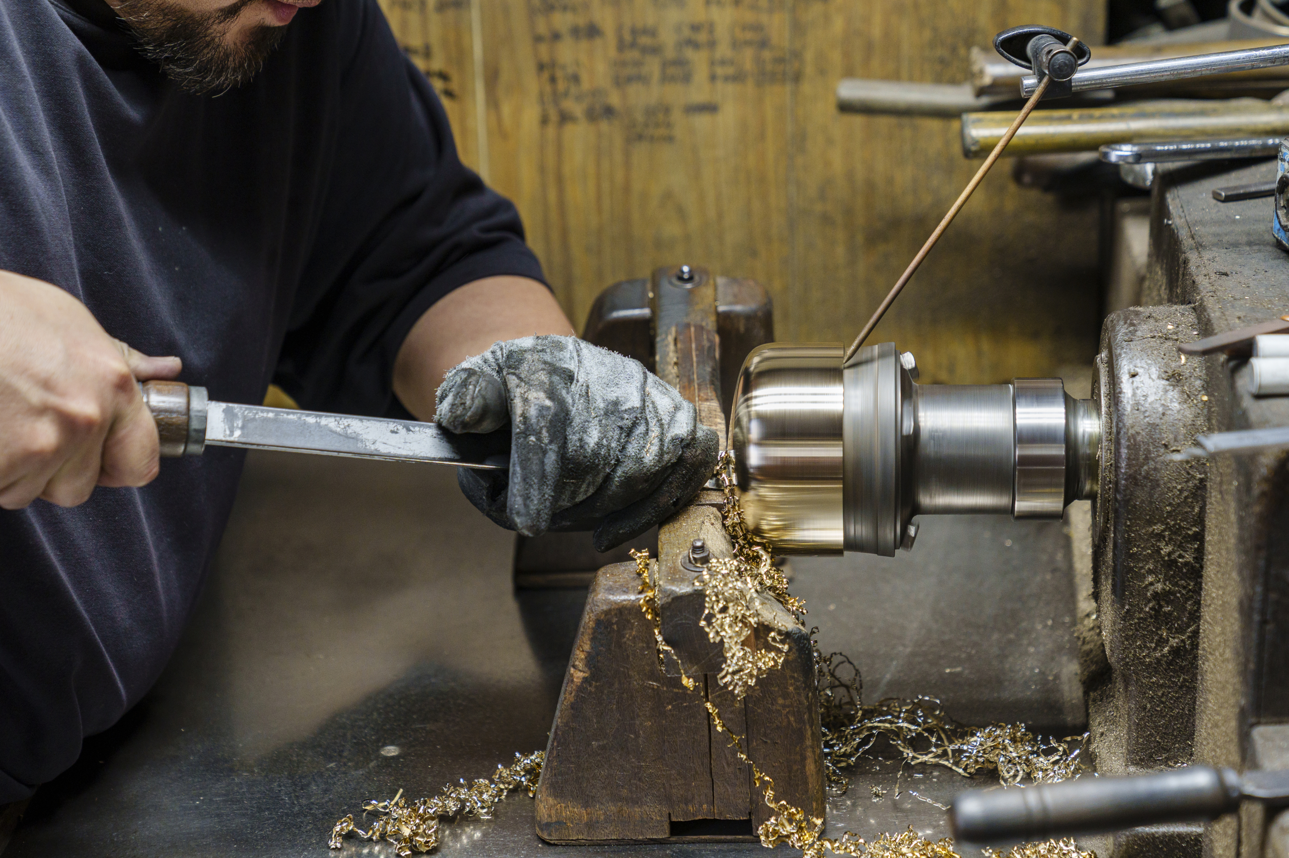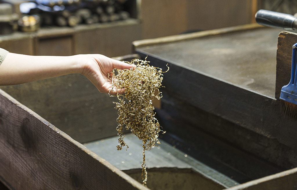 一般的に「おりん」は、銅と亜鉛を混ぜた真鍮(しんちゅう)製が多い中、「南條工房」では銅と錫(すず)を混ぜた佐波理(さはり)という合金を使います。佐波理は、奈良の正倉院に佐波理製の宝物が残るほど伝統的な材料です。