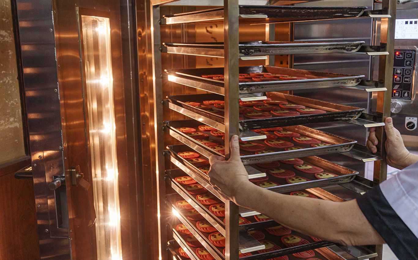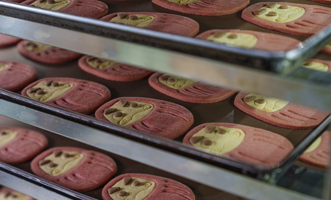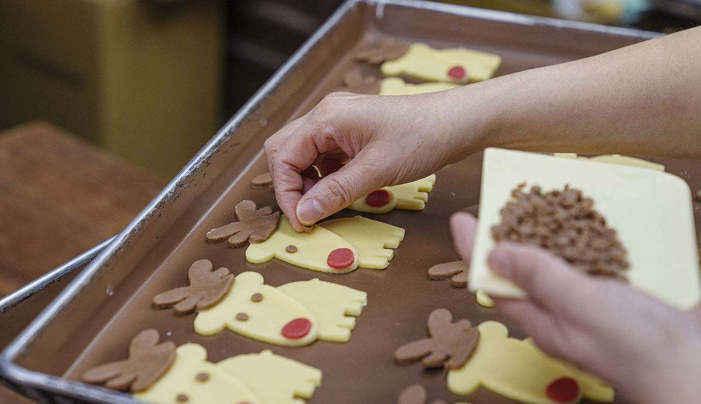 クッキーのおいしさを左右する生地づくりは、代表の4代目が担当。その生地を型で抜き、パーツを重ねていく作業は、すべて熟練スタッフの手作業で行われます。目の位置ひとつで雰囲気が変わるため、スタッフ同士で声を掛け合い、高いクオリティの維持に努めています。