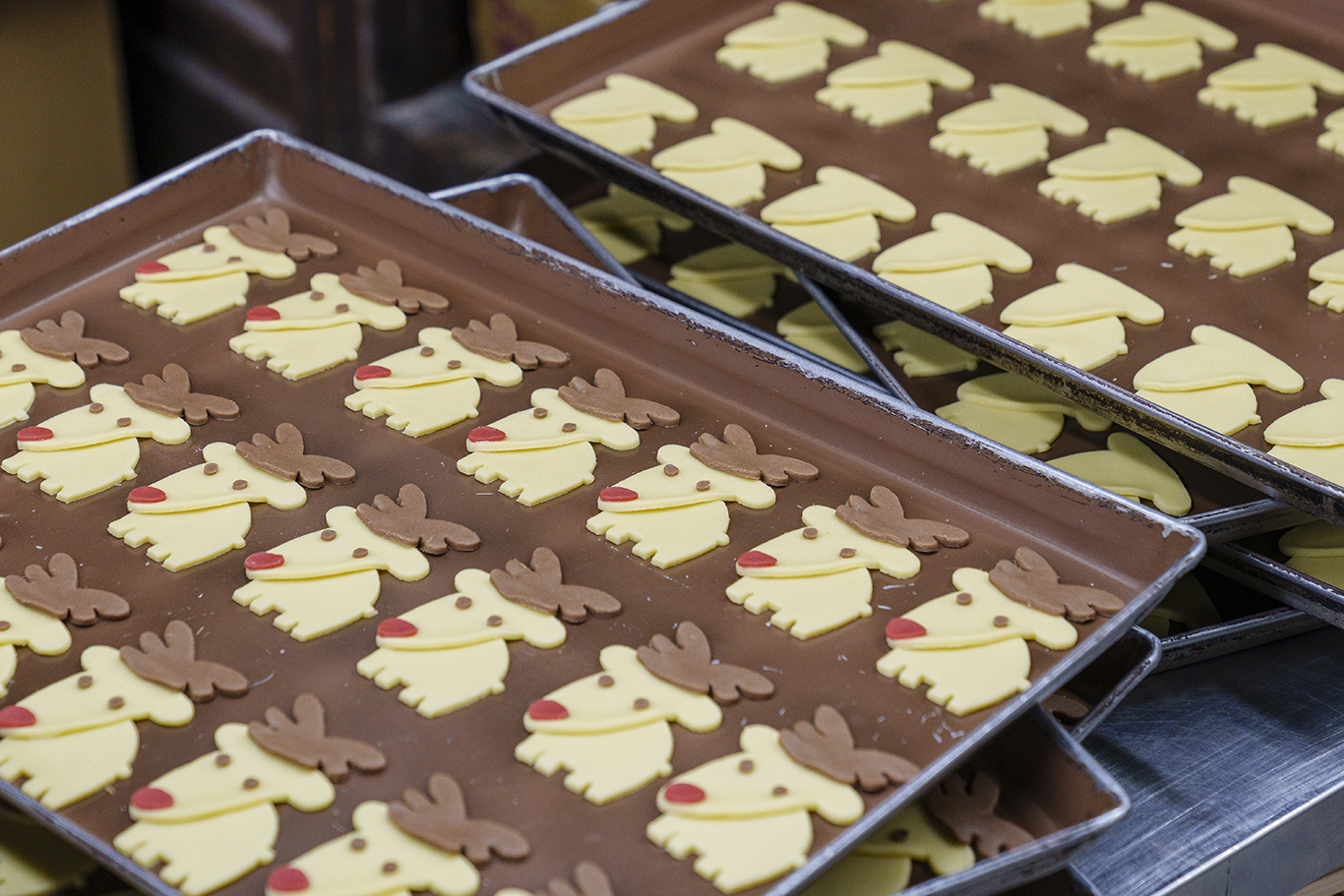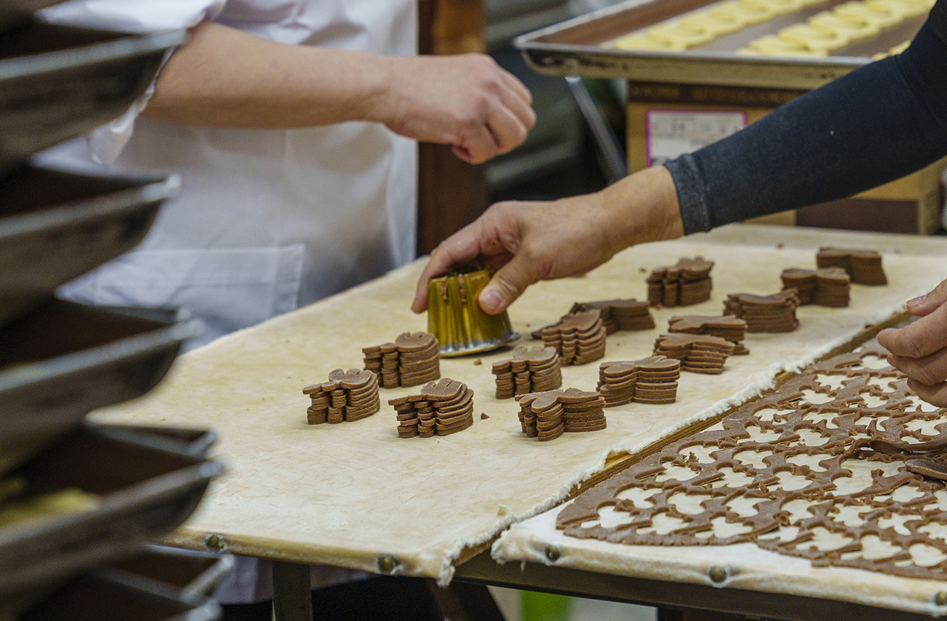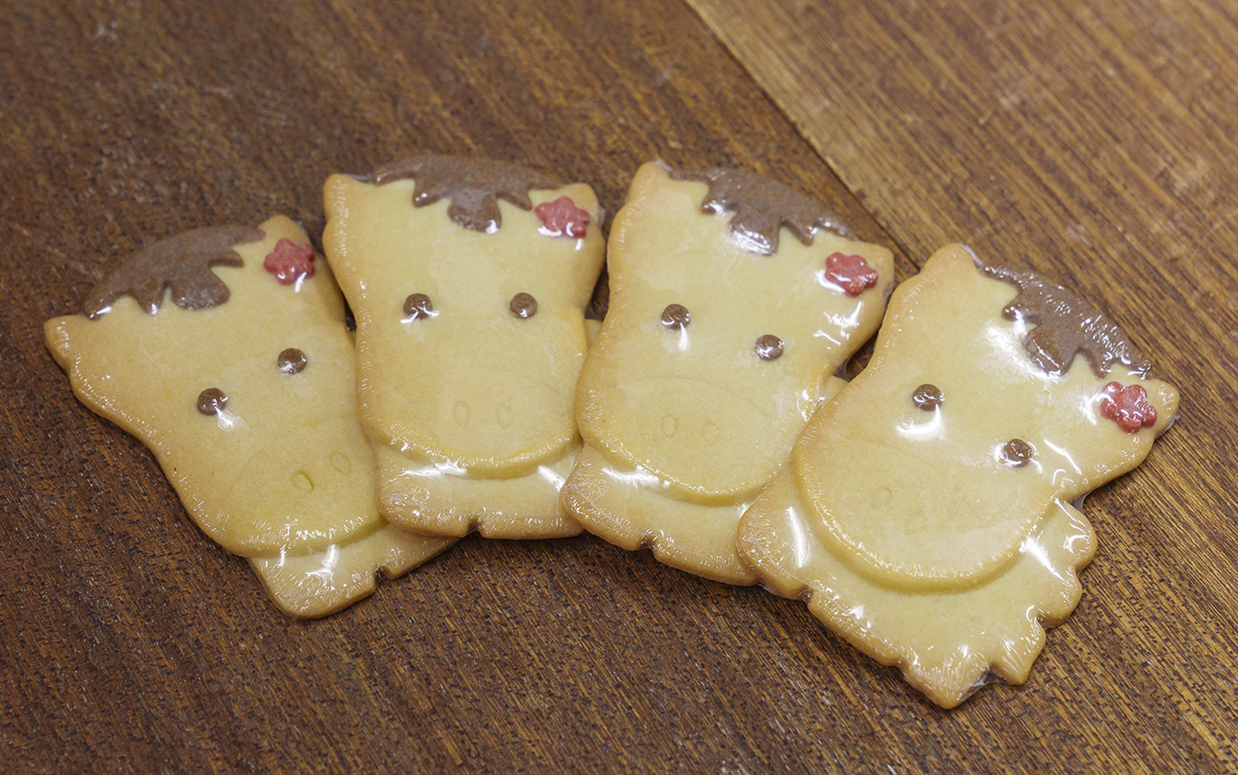 クッキーのおいしさを左右する生地づくりは、代表の4代目が担当。その生地を型で抜き、パーツを重ねていく作業は、すべて熟練スタッフの手作業で行われます。目の位置ひとつで雰囲気が変わるため、スタッフ同士で声を掛け合い、高いクオリティの維持に努めています。
